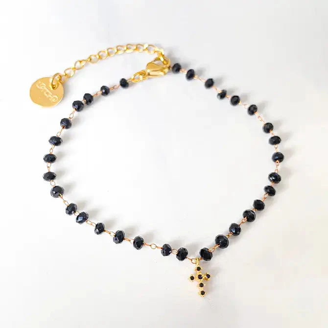 Bracelet black Mary mini croix perles noires