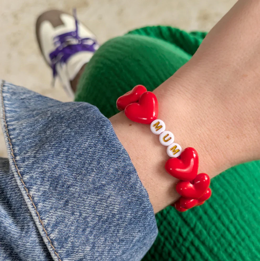Confectionné avec de grands cœurs rouges brillants, des perles lettres blanches et un joli nœud en jean, ce bijou coloré est monté sur un élastique souple pour un confort absolu.