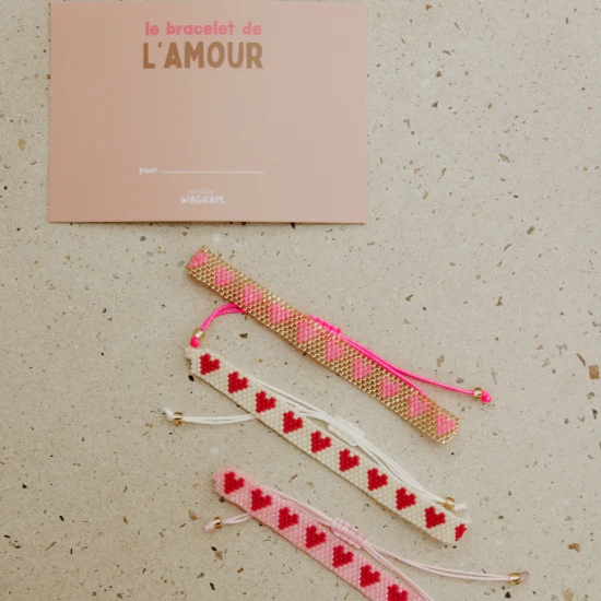 Ce bracelet perlé cœur rouge signé Atelier Wagram est une déclaration d’amour à porter au quotidien. Fait de délicates perles tissées, il forme une ligne de petits cœurs roses et dorés, symbole d’affection, de tendresse et de gratitude.