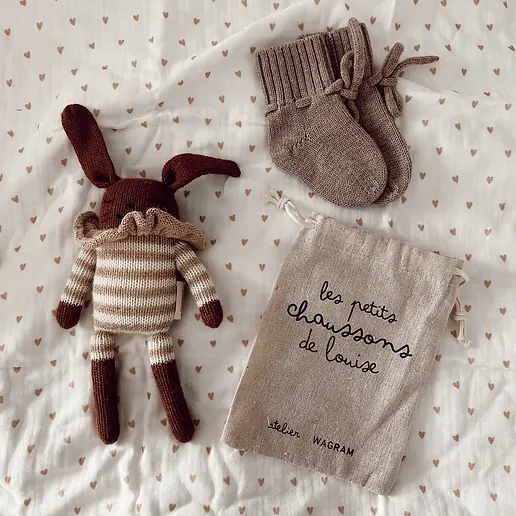 Petits chaussons pour bébé en laine mérinos avec noeud La laine mérinos est idéale pour réguler la chaleur et les chaussons peuvent donc être utilisés toute l’année. Convient aux bébés de 0 à 6 mois environ Livrés dans son pochon en lin qui peut être personnalisé au prénom
