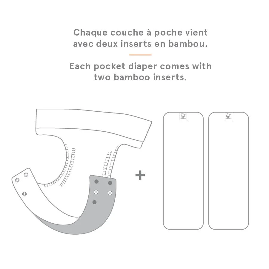 - Chaque couche La Petite Ourse vient avec 2 inserts de bambou ayant chacun 4 épaisseurs (4.5oz d’absorption pas insert).
