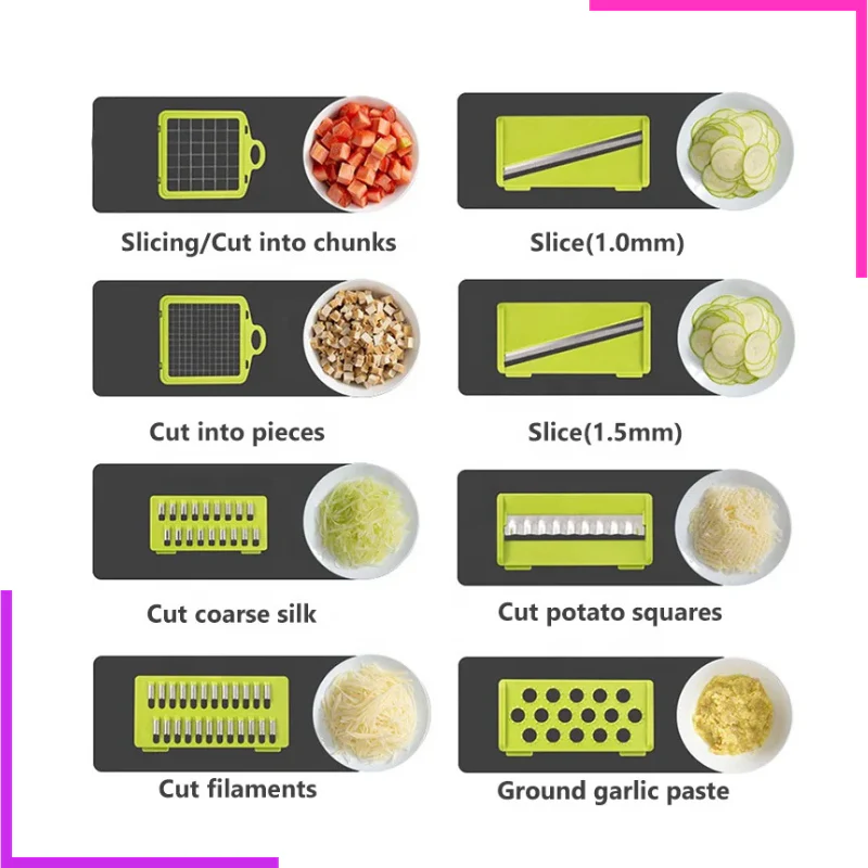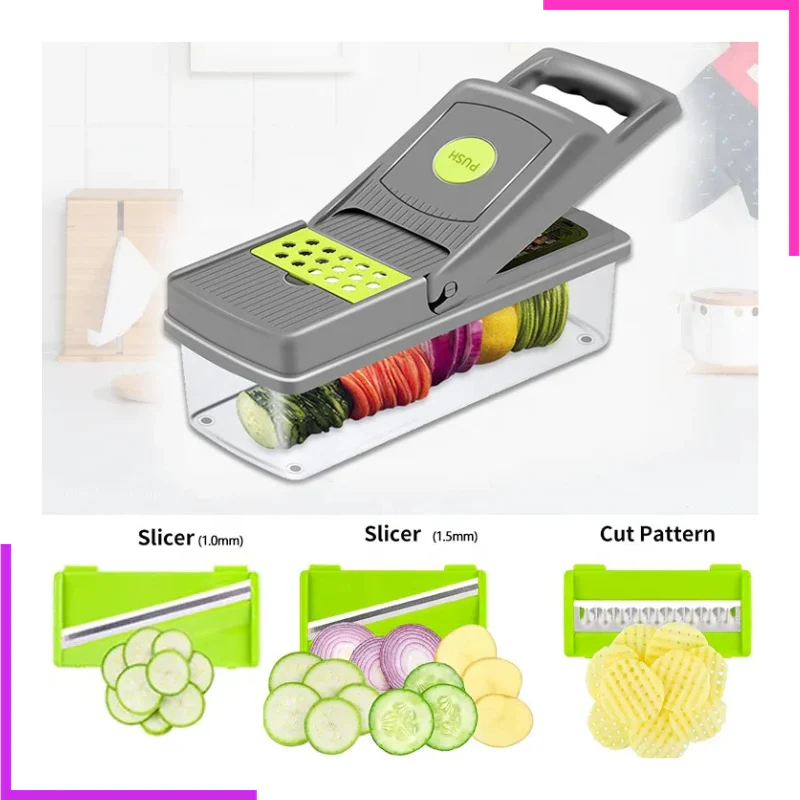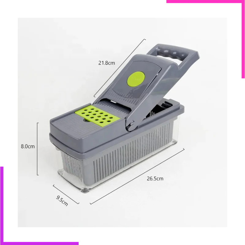 Coupe légume avec une variété d’options de coupe Préparer rapidement des plats En matière non toxique, avec des lames en acier inoxydable, tranchantes et antirouille Facile à utiliser et à nettoyer après l’utilisation Gardez-la hors de portée des enfants et ne jetez pas les lames.