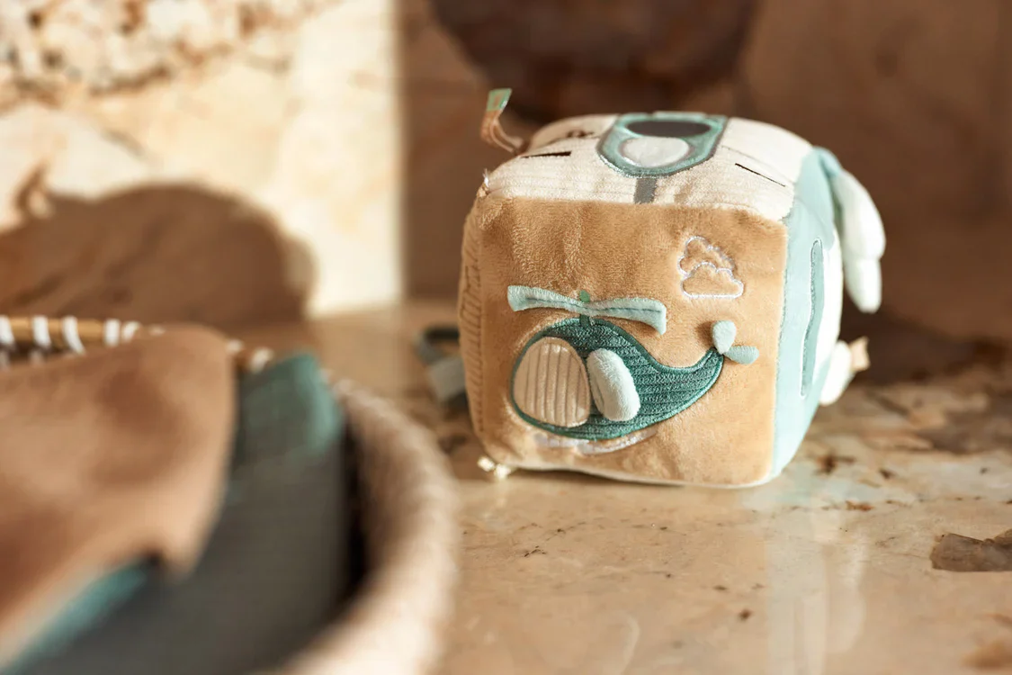 Cube en tissu tout doux aux couleurs tendres (bleu glacier, crème, sable)
