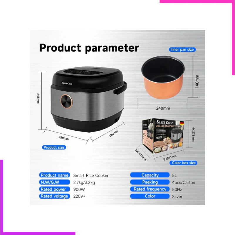 Préparez vos repas en toute simplicité avec le cuiseur à riz intelligent Silver Crest. Doté d’une capacité généreuse de 5 litres, il est idéal pour les familles nombreuses ou les amateurs de batch cooking. Son design moderne en acier inoxydable s’intègre parfaitement dans toutes les cuisines, alliant style et robustesse.