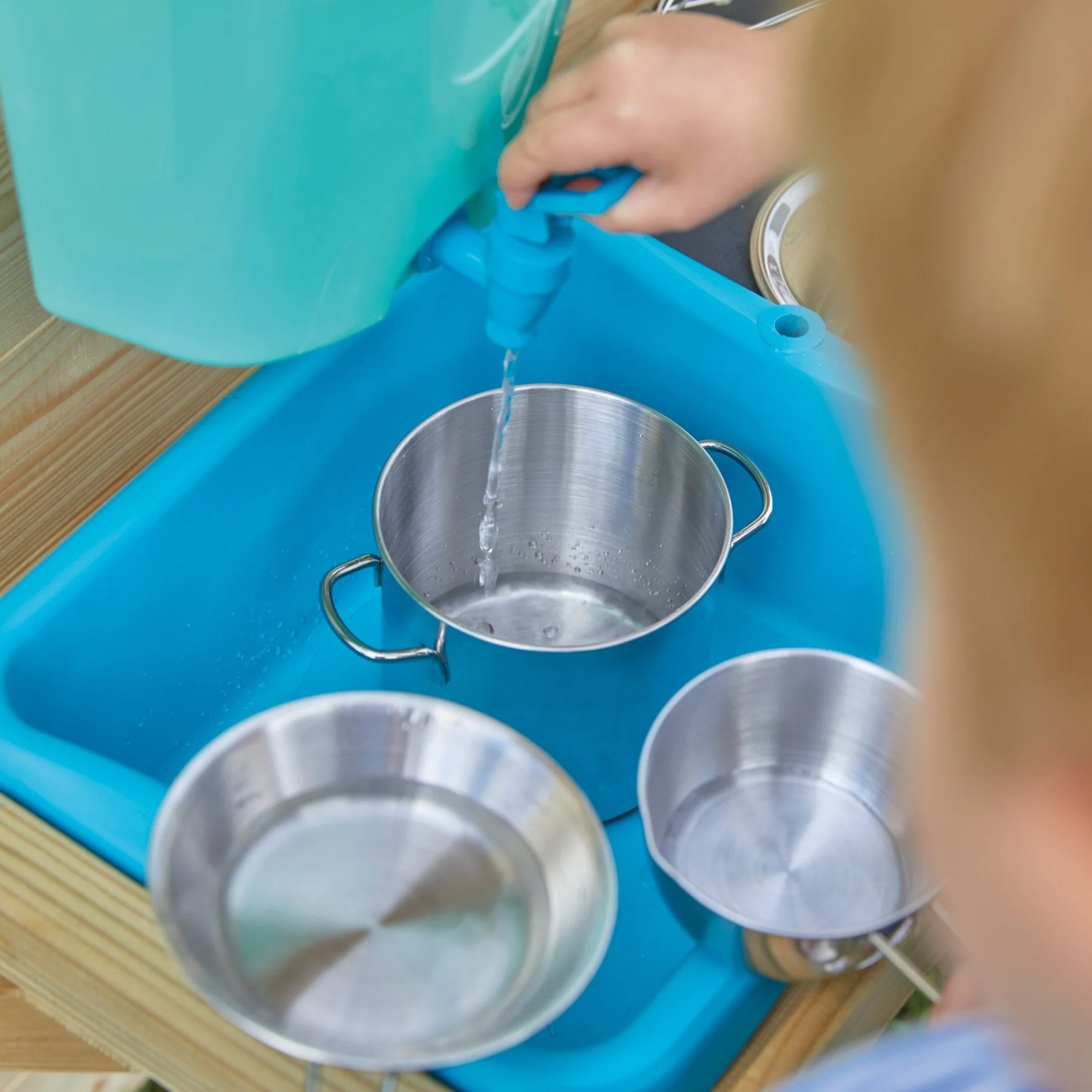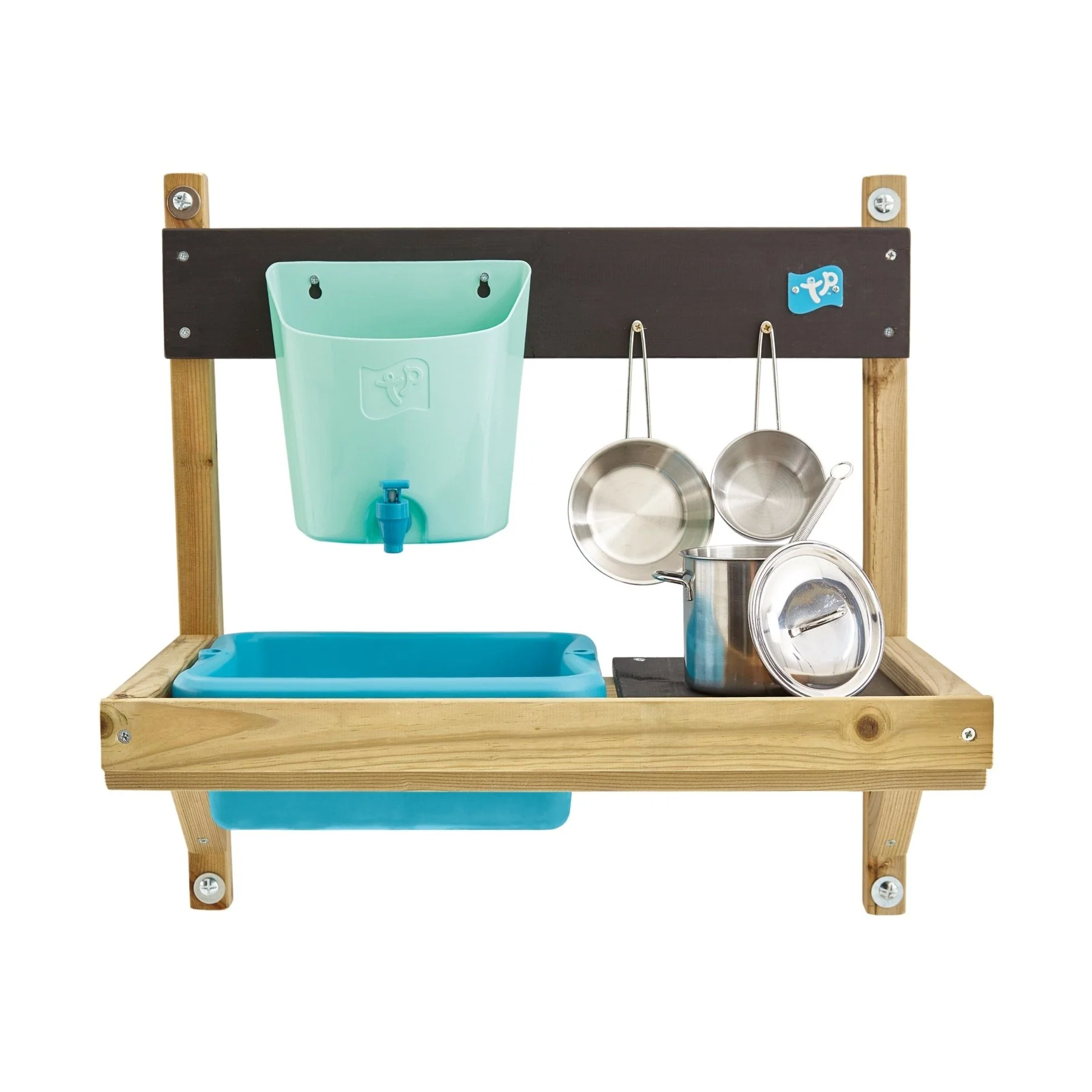 Cette cuisine extérieure compacte est livrée avec des ustensiles, un réservoir à eau avec un robinet, une bassine et des pochoirs, parfaite pour laisser libre cours à l’imagination de vos enfants et jouez avec la boue. Fixez la Cuisine sur le côté de leur cabane ou sur une autre surface adaptée : le jeu peut enfin commencer !