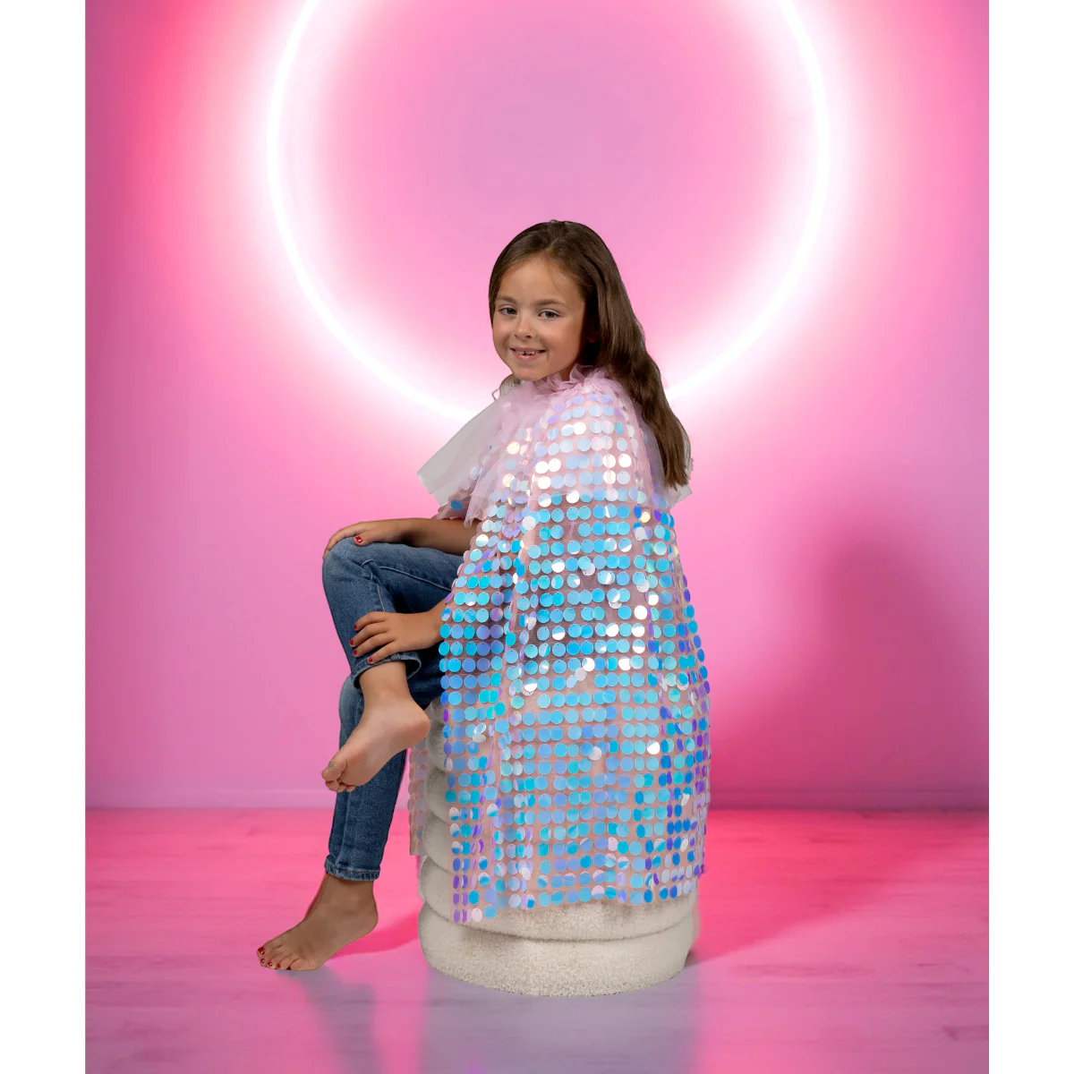 Faites briller les yeux des enfants avec la Cape Galaxia rose à sequins, un indispensable pour tous les petits rêveurs. Avec ses grands sequins irisés et son col en tulle doux, cette cape transforme instantanément chaque tenue en costume féerique.