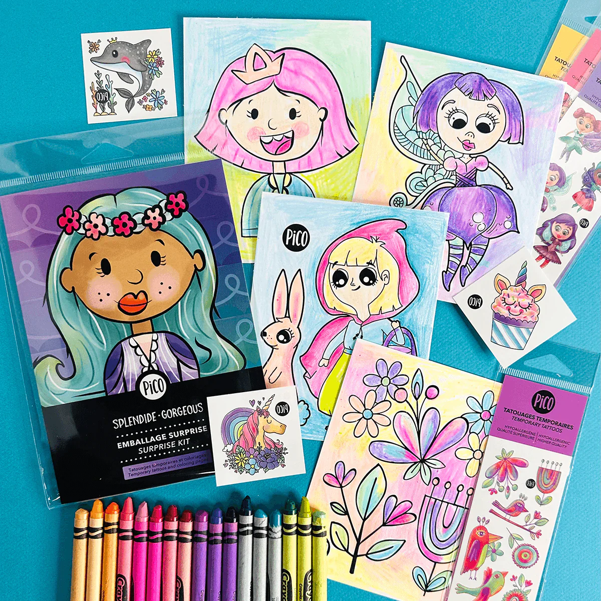 Les ensembles surprises sauront plaire à vos petits cocos. L’emballage surprise est idéal pour vos fêtes d’amis ou simplement pour amuser vos enfants. Ces ensembles comprend : 4 Feuilles de tatouages temporaires de format 2″x4″3 Tatouages temporaires de format 2ˮ x 2ˮ4 Coloriages thématiques