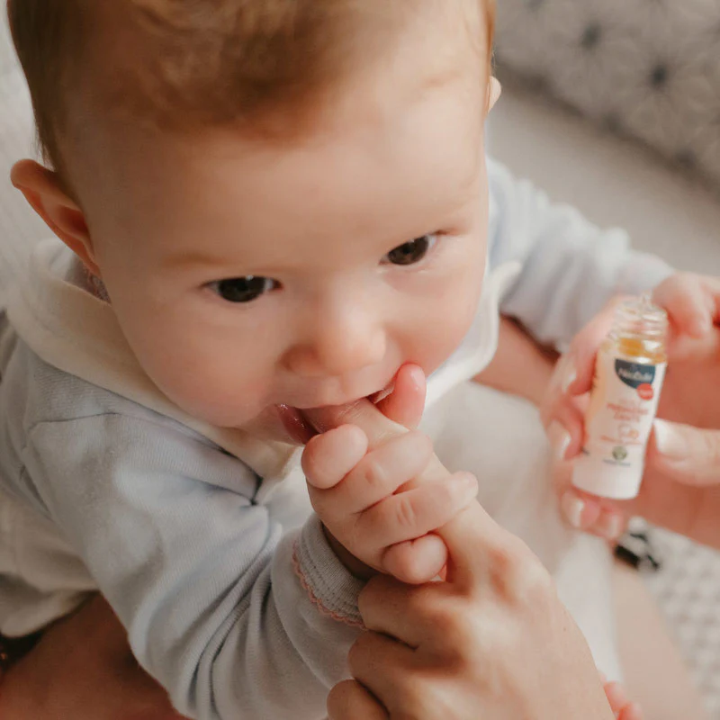 Huile calmante gingivale. Pour les bébés grognons avec les joues rouges. Apaise, calme et amollit la gencive lors des poussées dentaires. A partir de 3 mois.