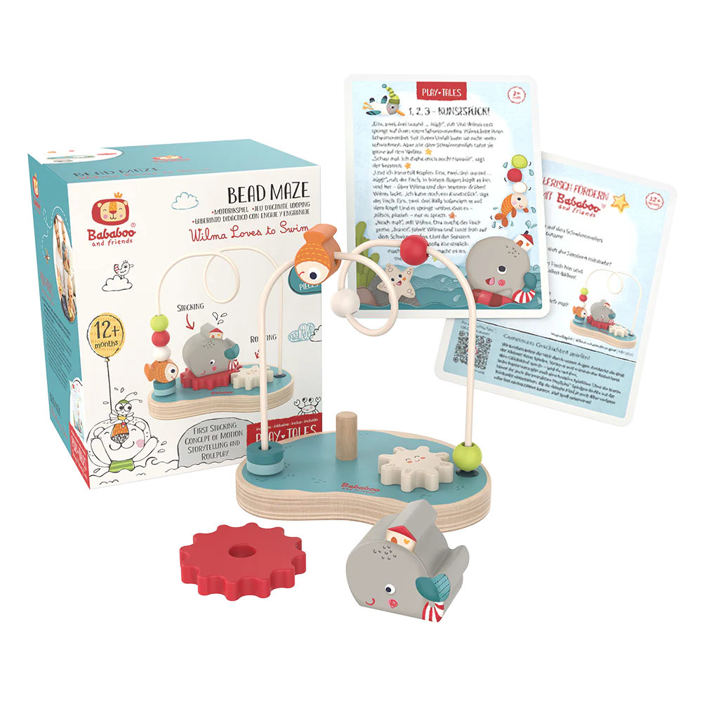 Vilma, la fille-baleine, est ravie : ses amis, l’étoile de mer et le drôle de poisson, lui montrent des tours à couper le souffle. Vilma veut pouvoir faire ça aussi. Malgré sa nageoire blessée, elle danse et saute joyeusement. Pousser, tourner, coller – ce jeu d’adresse offre aux enfants à partir de 12 mois beaucoup de choses à découvrir. Des éléments colorés peuvent être poussés, l’étoile de mer peut être tournée et la figurine et la bouée peuvent être placées sur le jeu. L’histoire du jeu qui l’accompagne est claire : tout le monde peut faire des tours. De préférence ensemble !