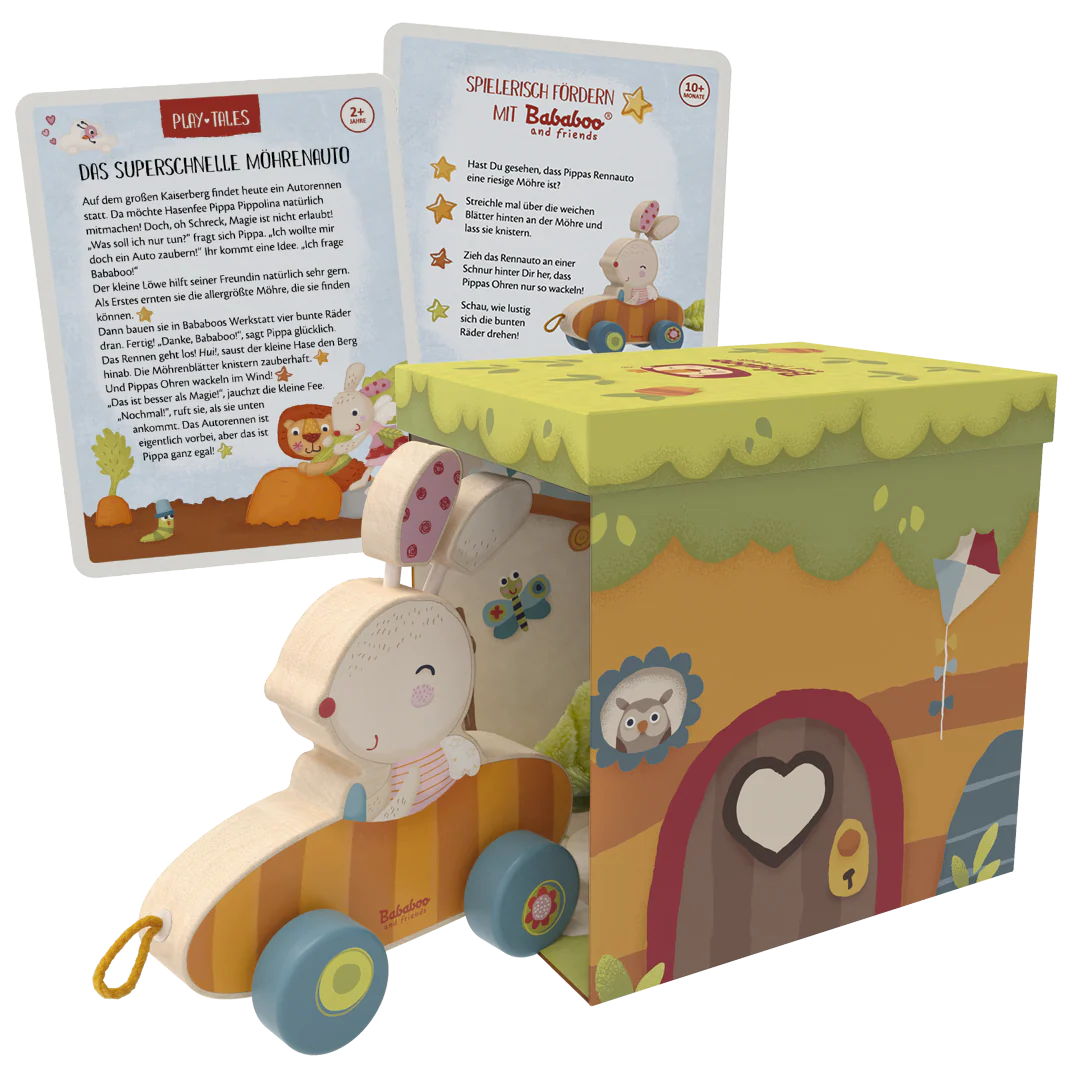 Pipa et Bababoo gagnent beaucoup avec peu en transformant une carotte en voiture rapide sans aucune magie. Pipa court alors sur chaque montagne et sur chaque lit d’enfant, ravie. Les jouets à tirer Bababoo and Friends® sont les compagnons idéaux de chaque tout-petit !
