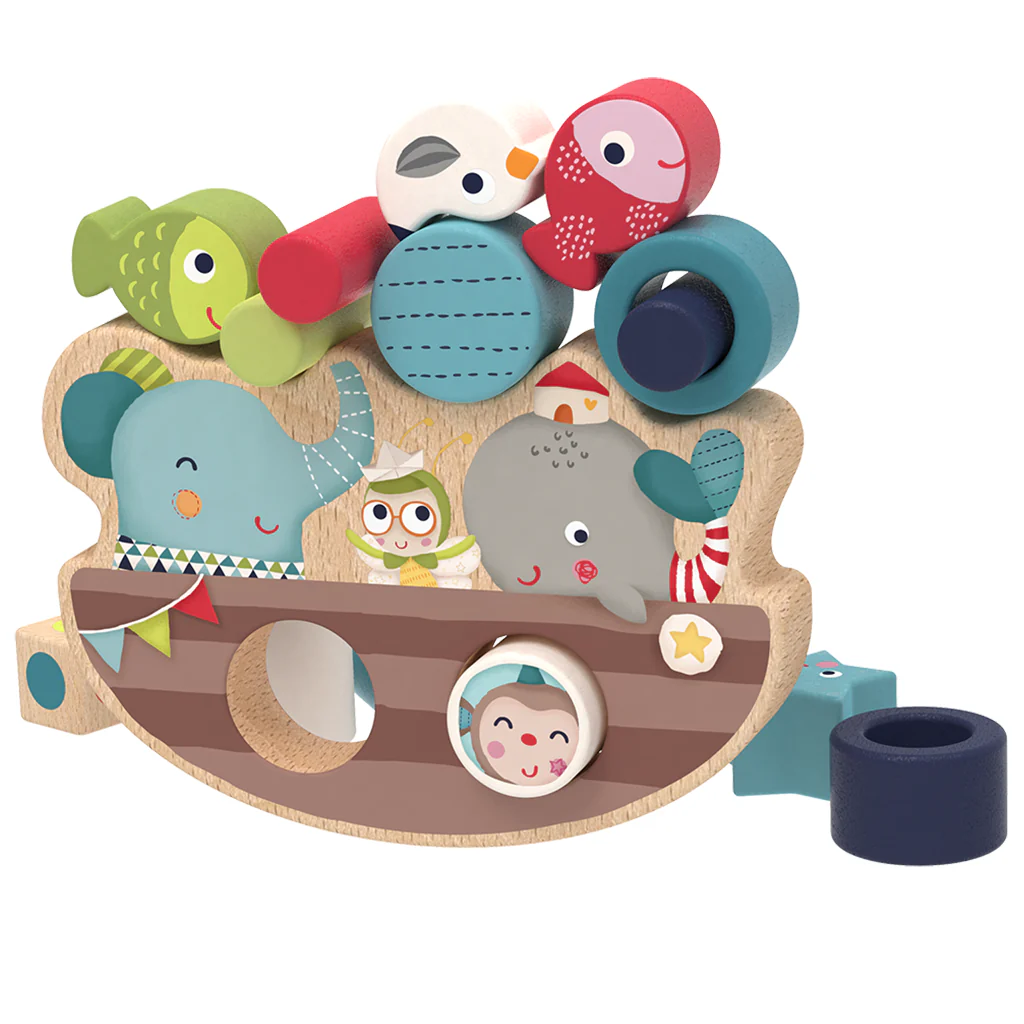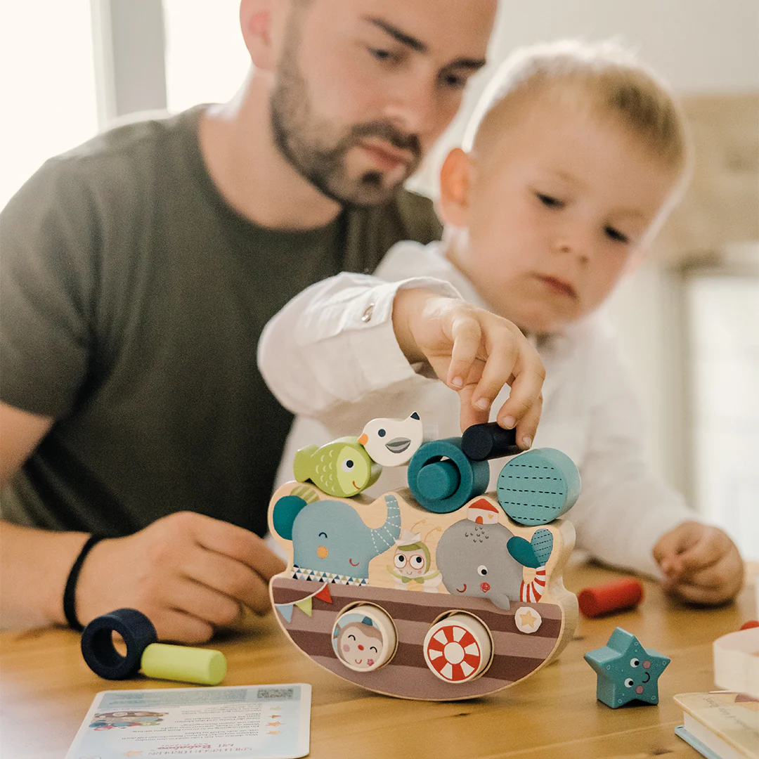 Ici, créativité et compétence sont requises ! Au total, 14 blocs de construction doivent être placés sur le bateau qui vacille. Un véritable défi pour petits et grands !
