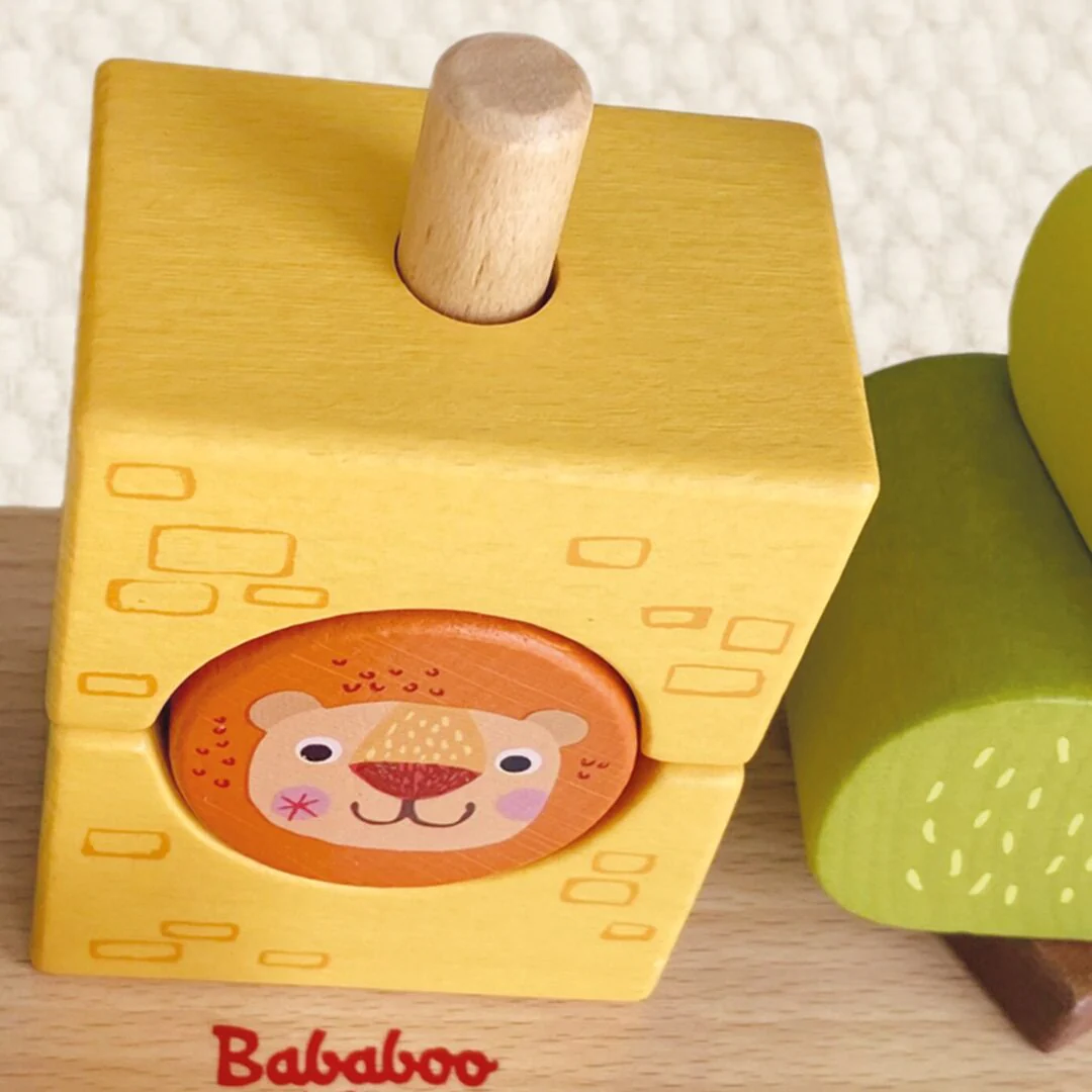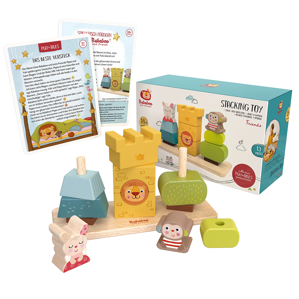 C’est dans sa chambre que Bababoo trouve ses meilleures cachettes. Pipa et Youki passent tant de temps à le chercher qu’il finit par s’endormir ! Riches en couleurs, les jouets à enfiler et à empiler Bababoo and friends® séduiront tout as de l’empilage. Les belles pièces en bois aux formes et tailles diverses peuvent être empilées les unes sur les autres.