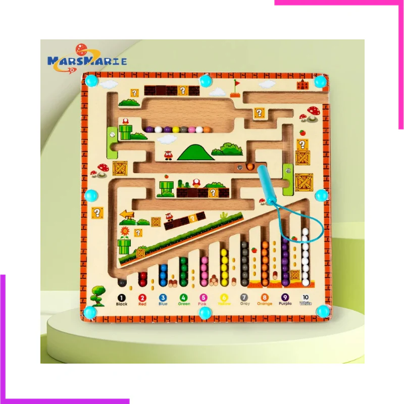 Stimulez l’apprentissage tout en vous amusant avec ce magnifique labyrinthe en bois inspiré d’un univers de jeu vidéo iconique ! Grâce à son stylet magnétique, votre enfant guide les billes colorées à travers le parcours, pour les trier par couleur et nombre.