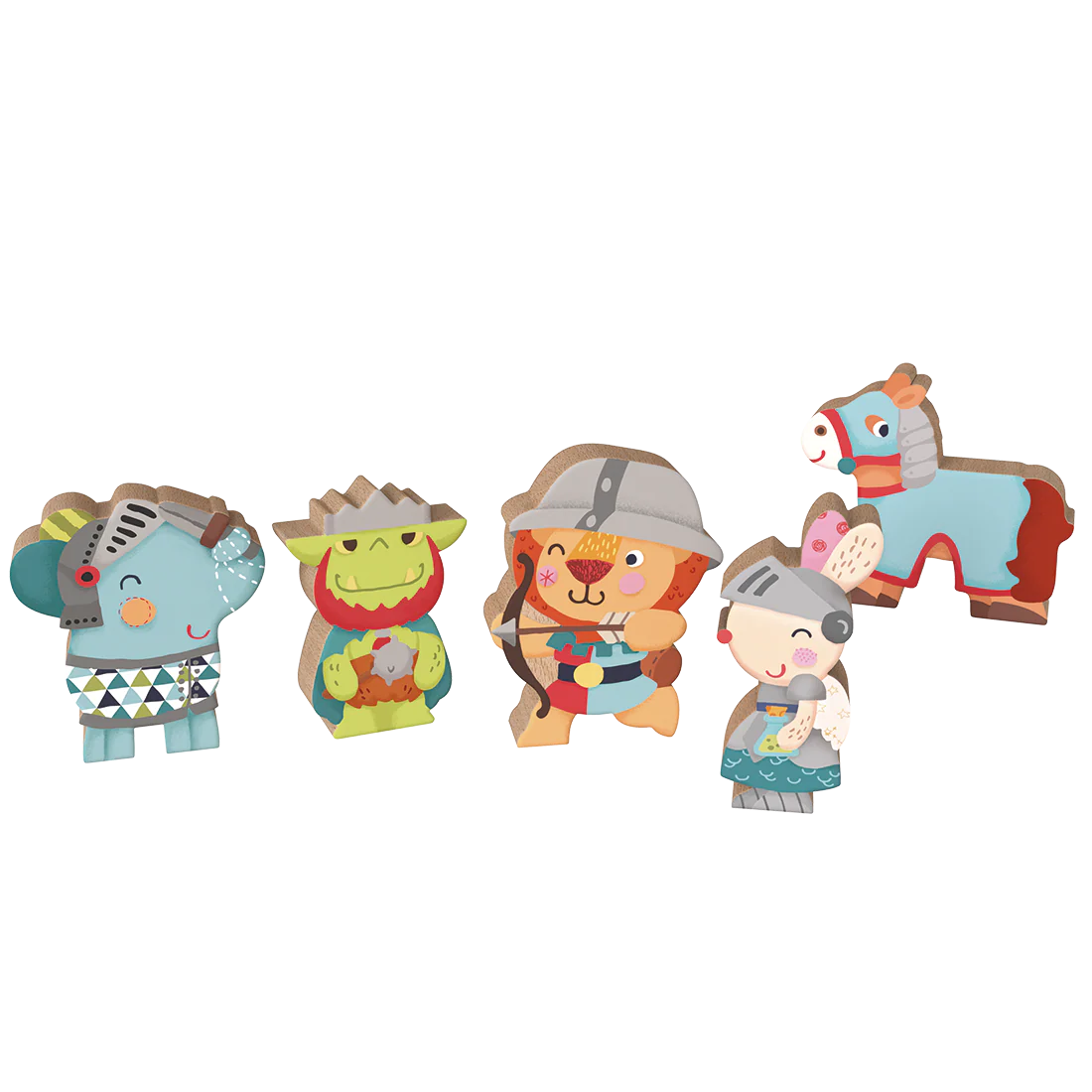 – Ensemble de 5 pièces en bois de haute qualité : le chevalier Bababoo, le chevalier Lolo, la dame Pipa, le chevalier et le dragon