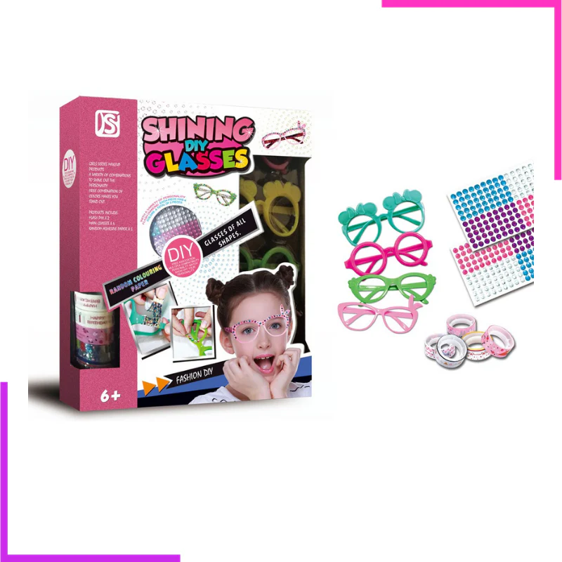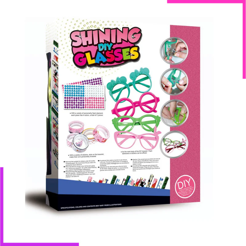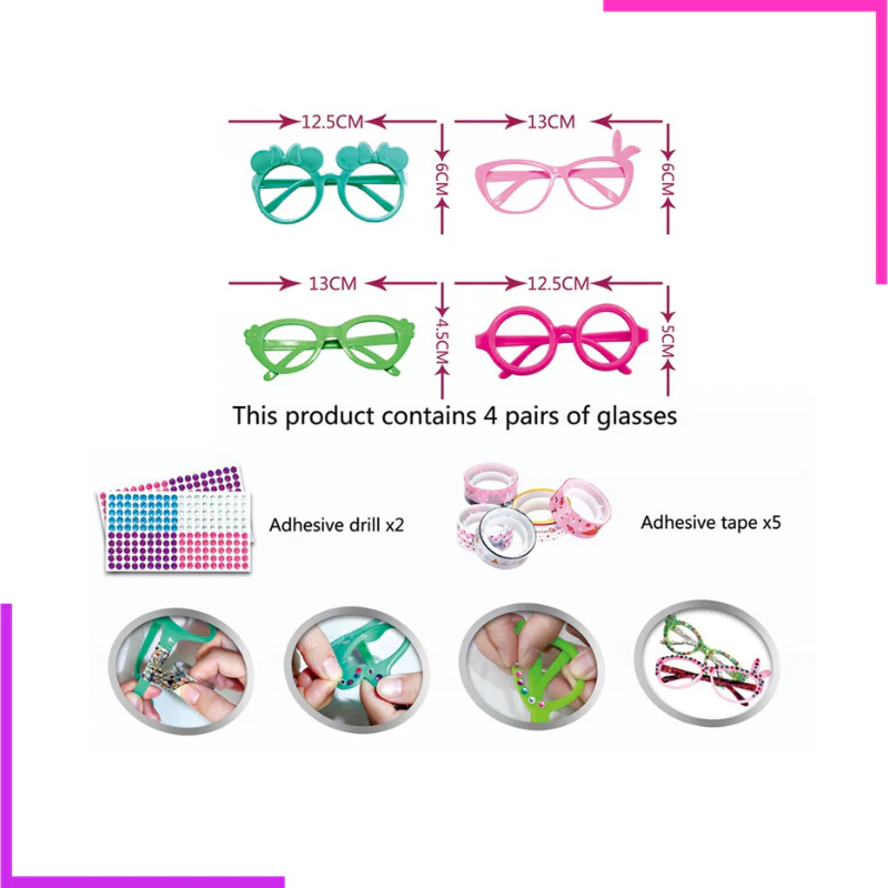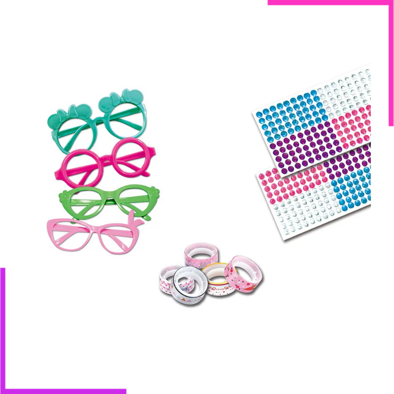 - Une manière amusante et colorée d’apporter une touche personnelle aux lunettes avec de la colle décorative (inclus) et une possibilité d’ajouter des perles adhésives (inclus) pour plus de brillance