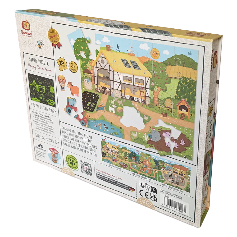 Le puzzle d’histoire de 24 pièces représente une journée heureuse à la ferme avec Bababoo le lion et ses amis. Deux mini-puzzles intégrés composés chacun de deux pièces, Lolo dans le tracteur et Vilma dans la mare de boue, complètent le motif. Bababoo le lion et une vache animent le jeu de rôle créatif en tant que personnages supplémentaires. Et lorsque le soleil se couche le soir, le paysage brille d’un fascinant effet phosphorescent.