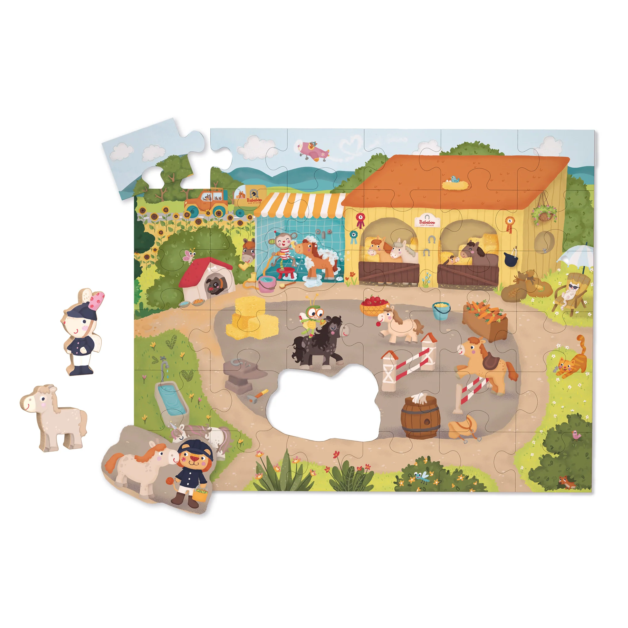 Ce puzzle à histoires de 36 pièces invite les enfants à passer une journée palpitante dans l’écurie.