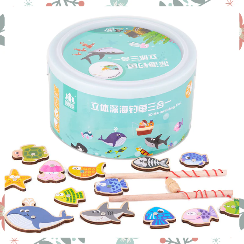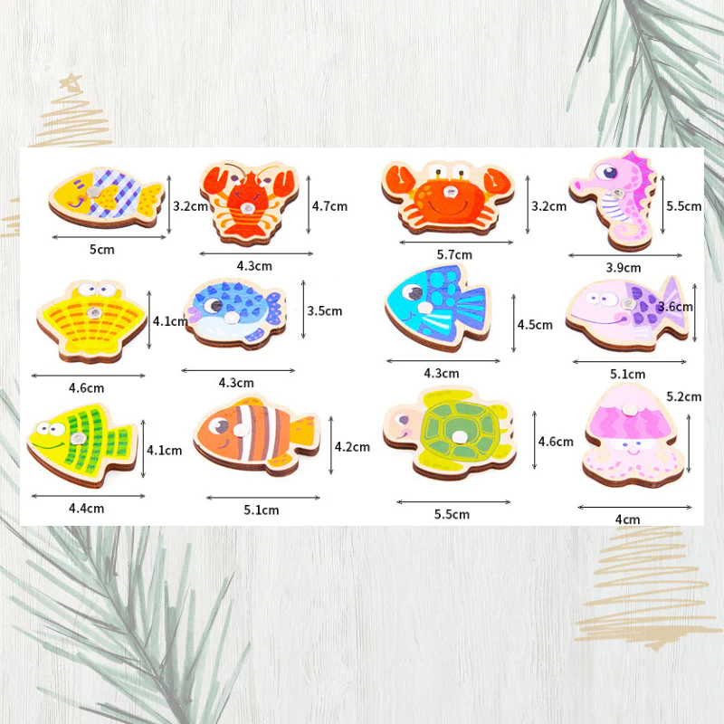 - Composition: 13 poissons, une plateforme en puzzle de bois avec une scène maritime en 3D et deux cannes à pêche dans une jolie boîte d’étang à poissons réutilisable
