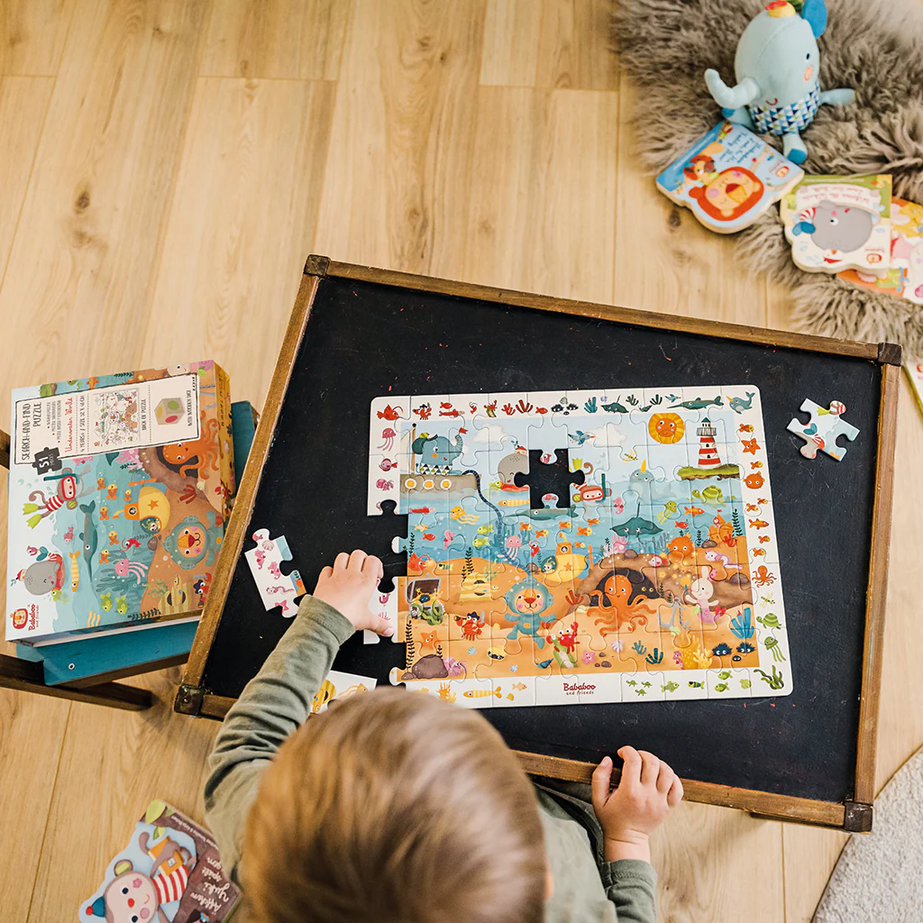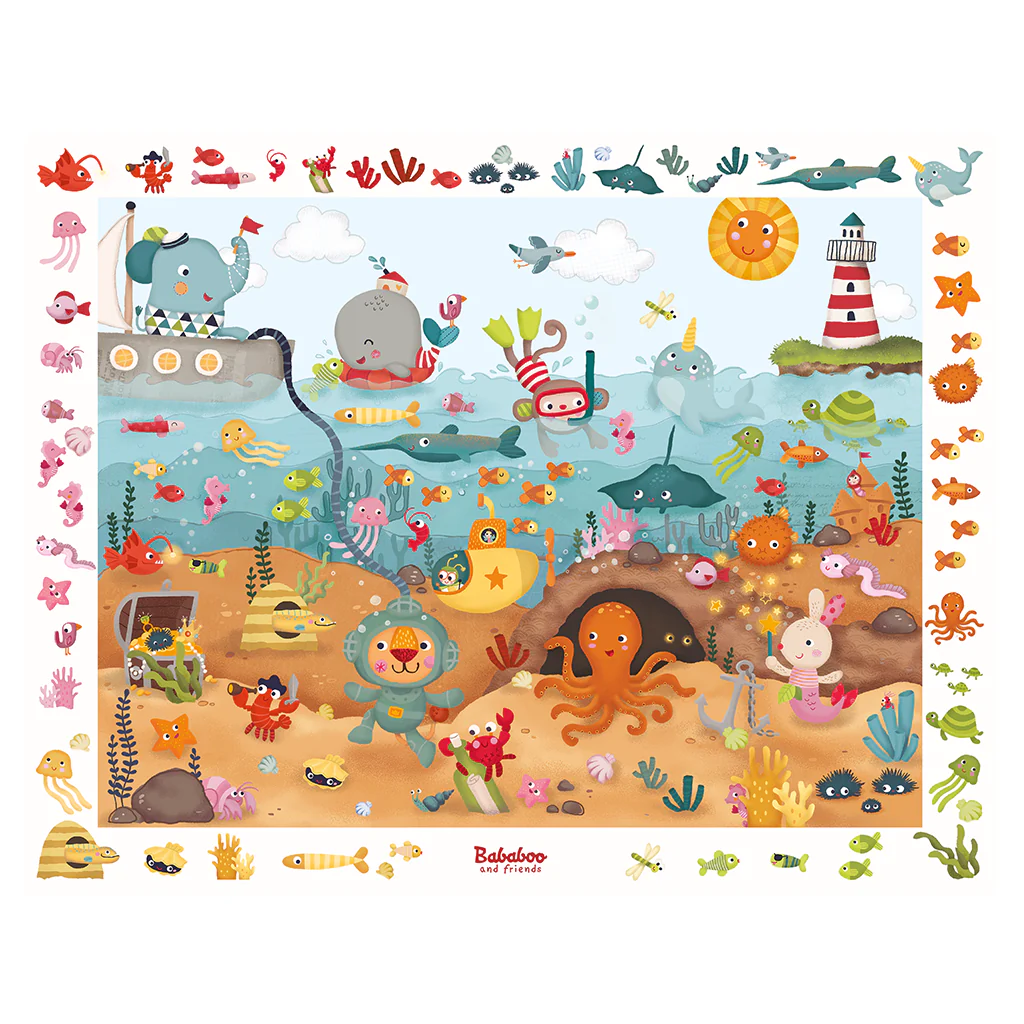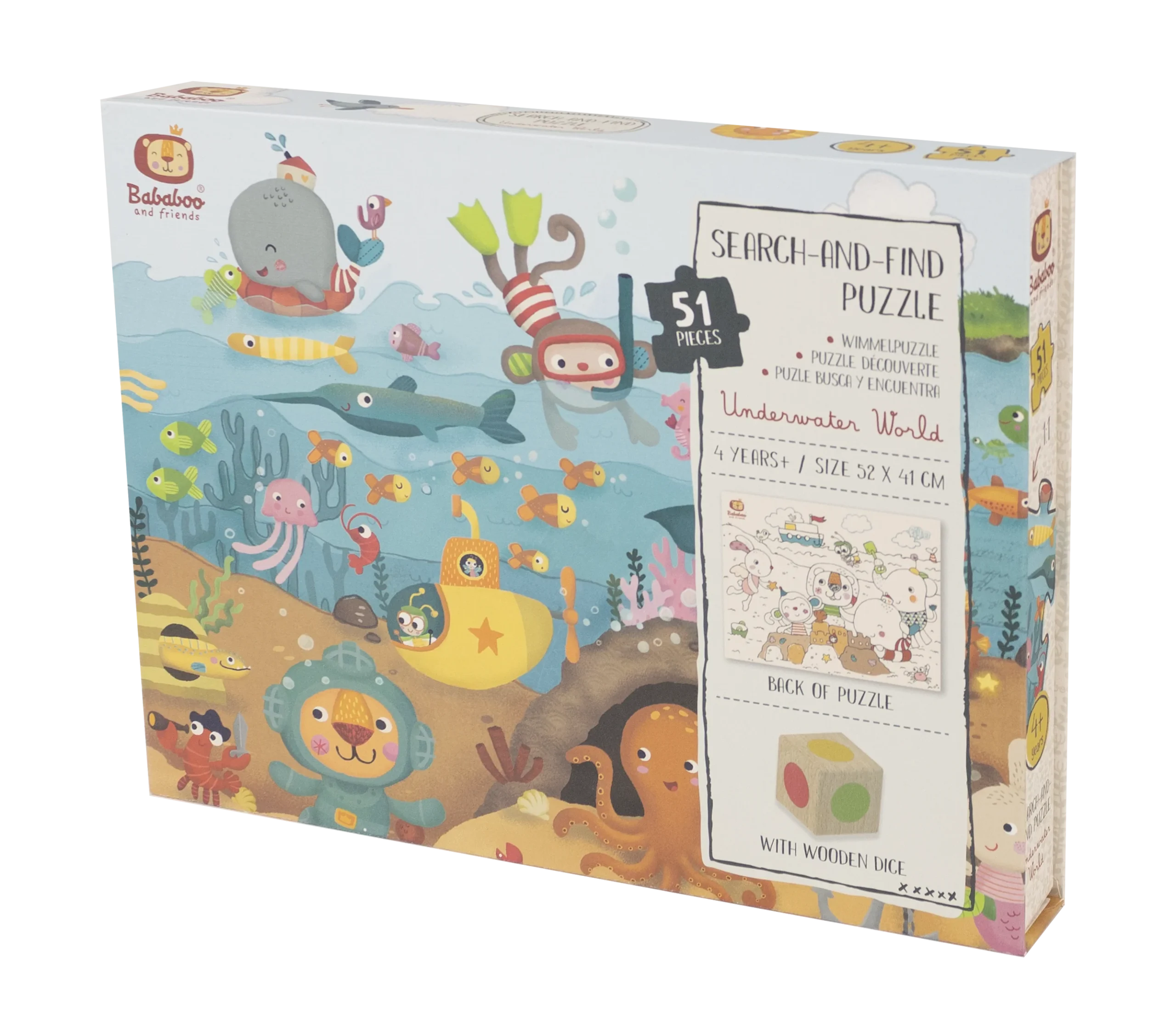 Le premier puzzle d’objets cachés à partir de 4 ans dans notre monde du jeu et de la lecture invite non seulement les enfants à assembler 50 pièces, mais est également un jeu de dés. Selon la couleur roulée, il y a beaucoup à découvrir dans le monde sous-marin. Ajout spécial : le dos ajoute un modèle de coloriage montrant le plaisir sous-marin avec le lion Bababoo et ses amis.