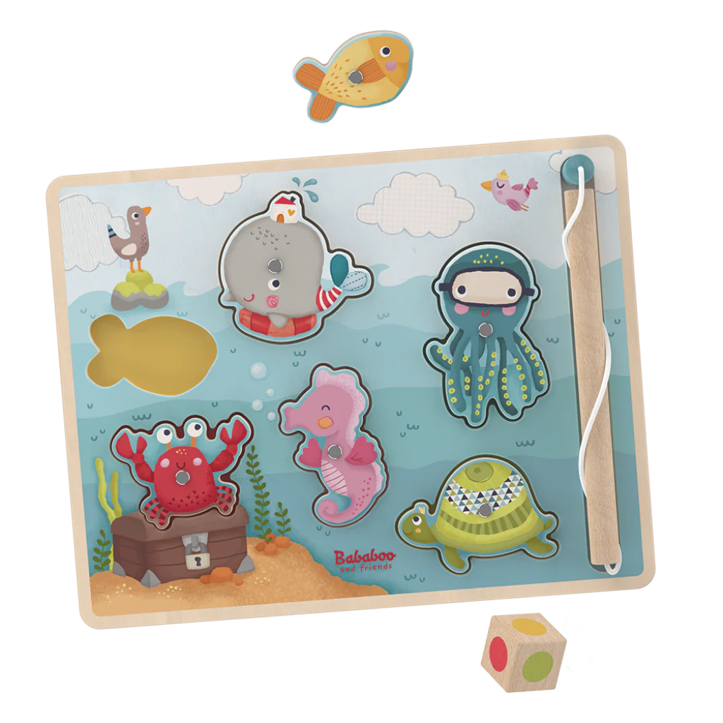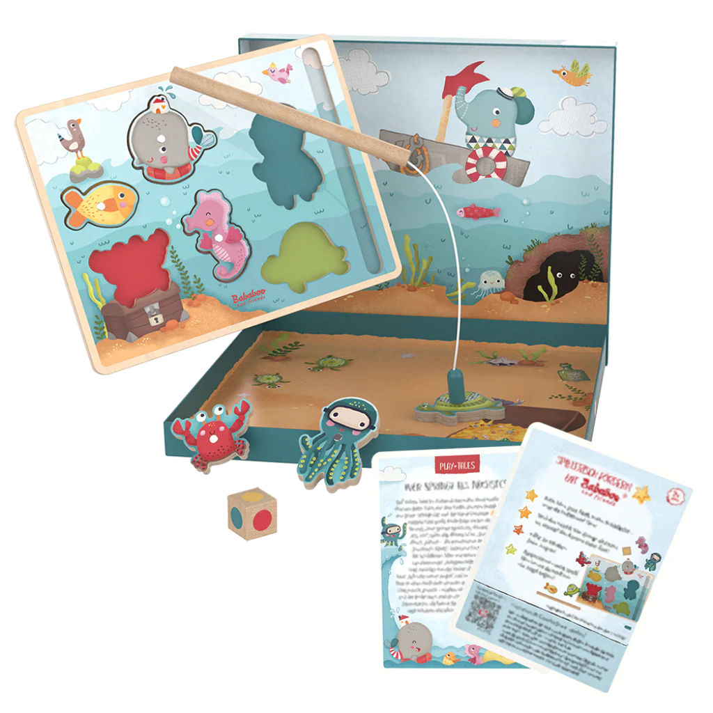 La baleine Vilma est heureuse : elle joue toute la journée dans la mer avec ses amis : pêcher des animaux marins, trier et nommer les formes et les couleurs – dans l’océan, la petite baleine ne s’ennuie pas. Ce jeu de pêche puzzle stimule l’habileté et entraîne la motricité des enfants de 24 mois et plus, non seulement en plaçant correctement Vilma et ses amis dans le puzzle, mais il sert également de jeu de dés. Selon la couleur du dé, l’animal correspondant est pêché dans la mer. Mais peu importe qui est repêché en premier et replacé dans le puzzle : Le plus important est que tout le monde s’amuse ensemble – c’est ce que raconte l’histoire du jeu jointe.