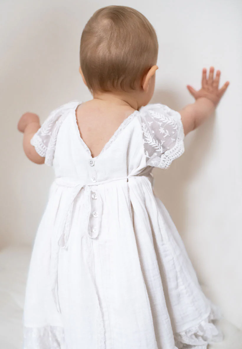 Vous aimerez d’ailleurs son look vintage, avec ses dentelles et ses manches papillons. Vous apprécierez également le jeu de transparence de ses dentelles dans le dos, qui apporte un côté délicat et raffiné. Par ailleurs, cette robe longue a été pensée pour être à la fois légère et aérienne. Sa conception en gaze de coton lui confère un caractère respirant, procurant à l’enfant douceur et fraîcheur toute la journée.