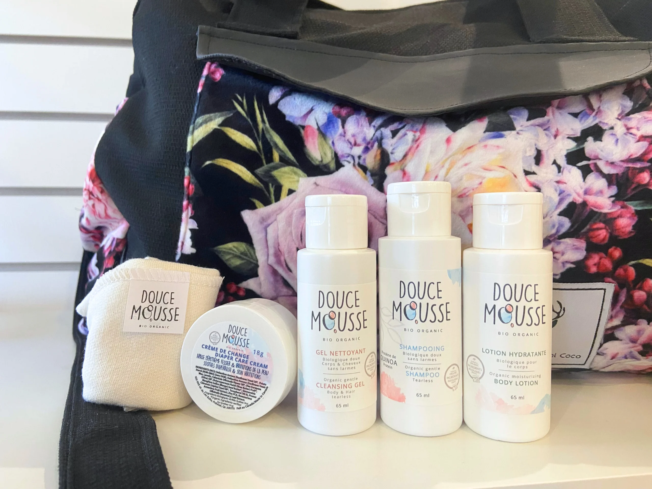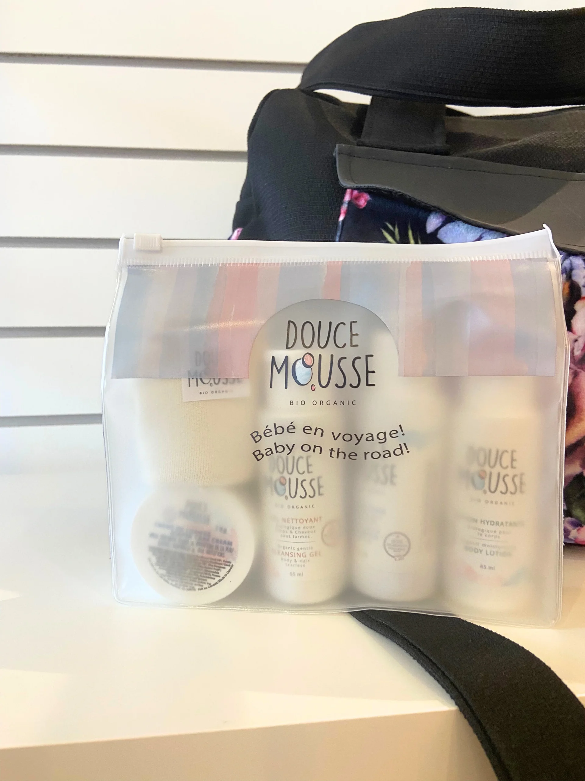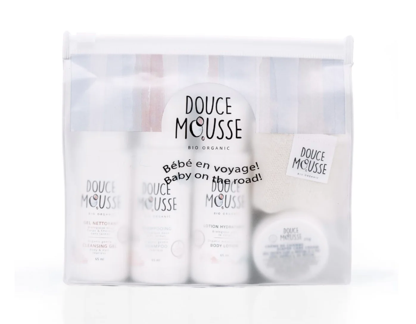 Idéal pour le sac à couche ou pour les visites chez les grands-parents, la trousse Douce Mousse »bébé en voyage » comprend: 1 gel nettoyant corps et visage 60 ml + 1 shampooing 60 ml + 1 lotion hydratante pour le corps + 1 crème de change 15g + lingette 100% coton bio, le tout dans une petite pochette hermétique munie d’une fermeture éclair.