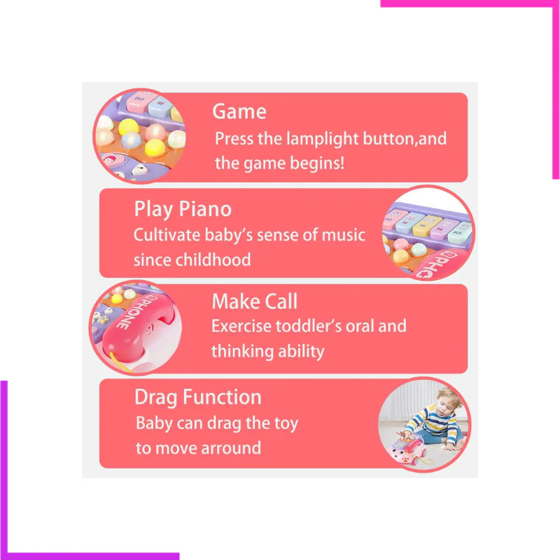 Jouet interactif 2-en-1 combinant téléphone, piano et apprentissage. 🔹 Fonctions : Appel simulé, clavier musical, lumières LED.🔹 Éducation : Chiffres, animaux, musique, fruits.🔹 Contrôle du volume : Mode réglable.🔹 Alimentation : Fonctionne avec piles (non incluses).🔹 Âge recommandé : Dès 12 mois. Parfait pour l’éveil sensoriel et la motricité fine ! 🎁